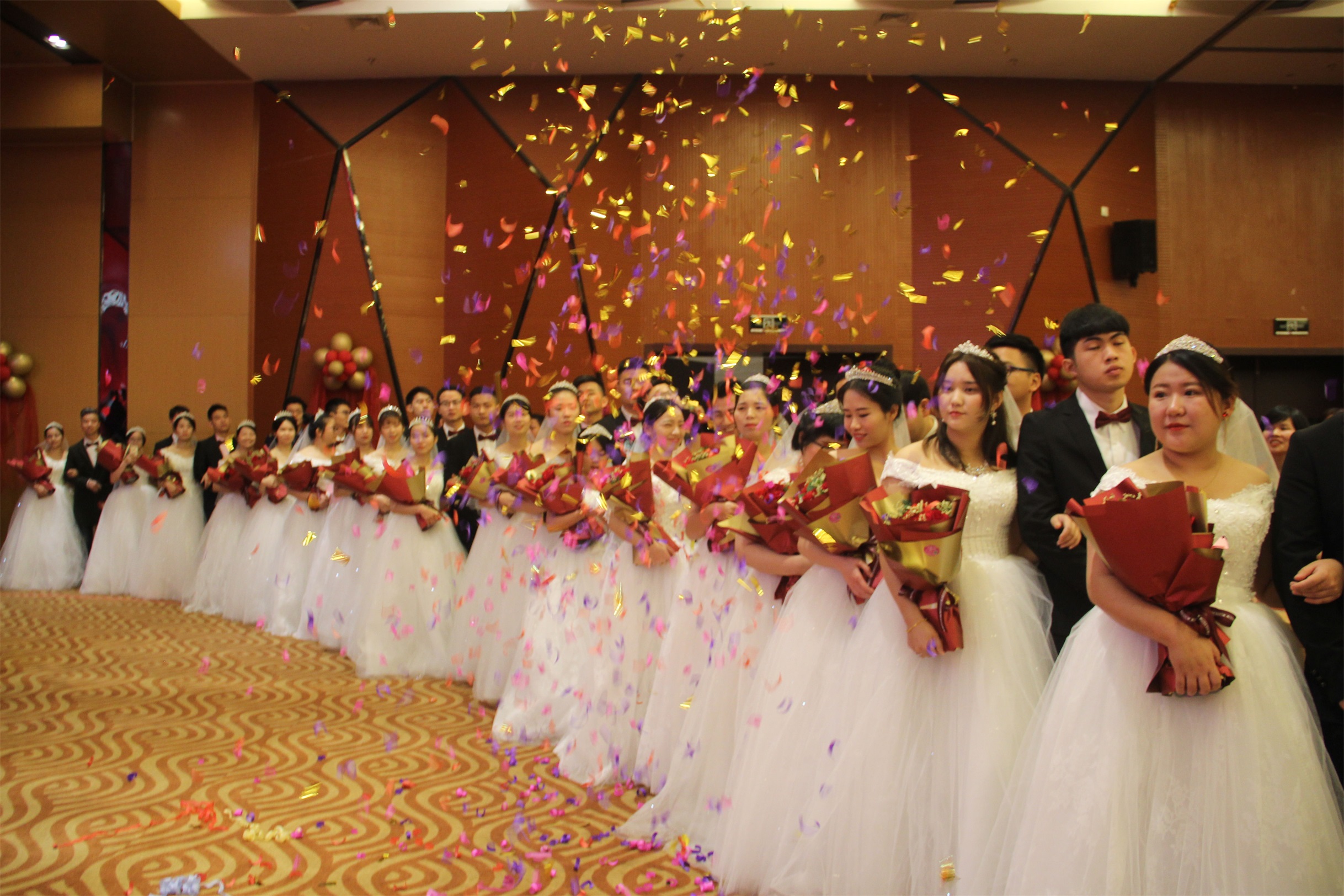 據(jù)悉,這是近年來泉州地區(qū)規(guī)模最大的集體婚禮,也是南安時(shí)隔20年再次舉辦大型集體婚禮?;顒?dòng)現(xiàn)場,火紅的地毯上,雪白的婚紗如波浪一樣涌動(dòng),70對(duì)新人在小花童的帶領(lǐng)下,伴著婚禮進(jìn)行曲,穿過“愛情門”,走向舞臺(tái),共同許下百年婚約。